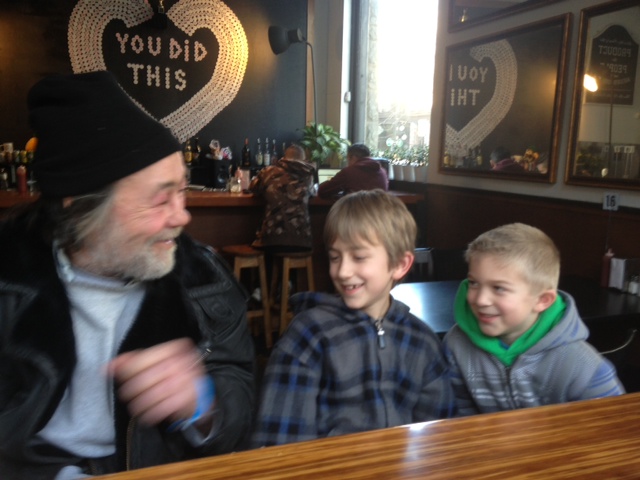 As we waited for lunch, Ron continually thanked us for taking him out. His voice was humble, soft spoken and rich. His eyes twinkled in the warm air, and you could see that weight was lifted as he engaged in youthful conversation with my boys. Ron agreed with Jaden that he should avoid my request for a much needed haircut, and he shrugged his shoulders and tilted his head in a smile when we talked about how much the boys hate vegetables.