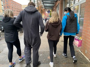 We decided to walk towards Cindy’s shelter hoping the staff could pass along our gifts. As we headed west on Hastings, a 6’3 man wearing a Helly Hansen onesie caught up to us and asked if we had anything to hand out.