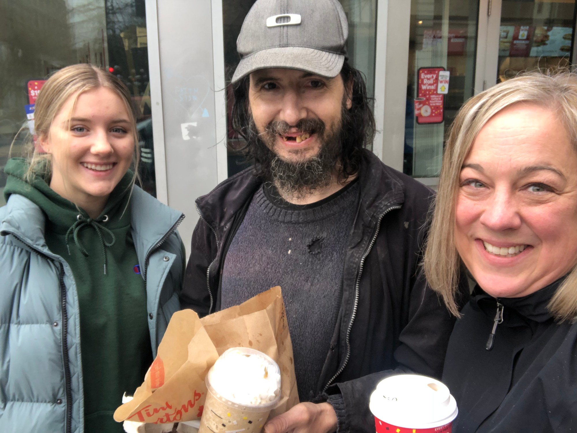 Conversation came easy as we joined the Tim Hortons line. Within seconds we had exchanged names and formed a new friendship. Steven came to Vancouver 20 years ago after growing up in Hamilton, Ontario. When we asked why he choose Vancouver he replied simply, “I had nowhere else to go.” Suspecting we were tourists, Steven recommended we visit Stanley Park or Second Beach. We explained we lived in the suburbs but had driven to Vancouver to spend some time in the DTES helping others in need. We asked if we could pay for his meal. With much appreciation, Steven asked for a French Vanilla coffee – pointing out it’s his favourite because you don’t have to ask for sugar as it’s already sweet. He also asked for a Boston Cream donut. This led to a friendly debate as to whether donuts should be stuffed. (My vote is a hard no.)