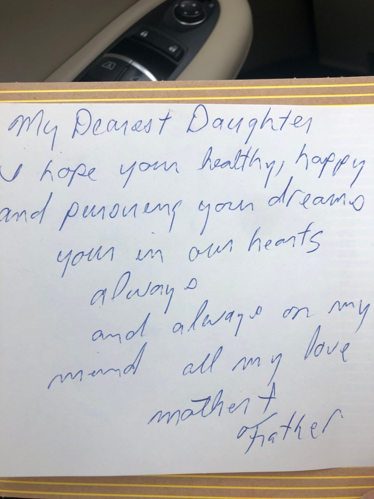 “My dearest daughter – I hope you are healthy, happy and pursuing your dreams. You’re in our hearts always and always on my mind. All my love, mother and father.”
