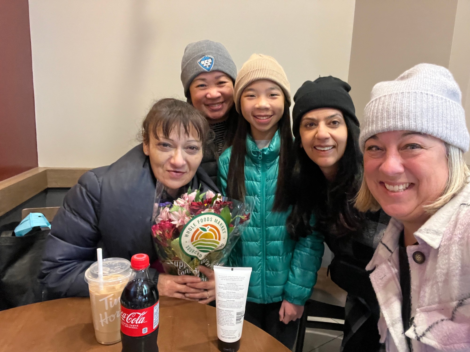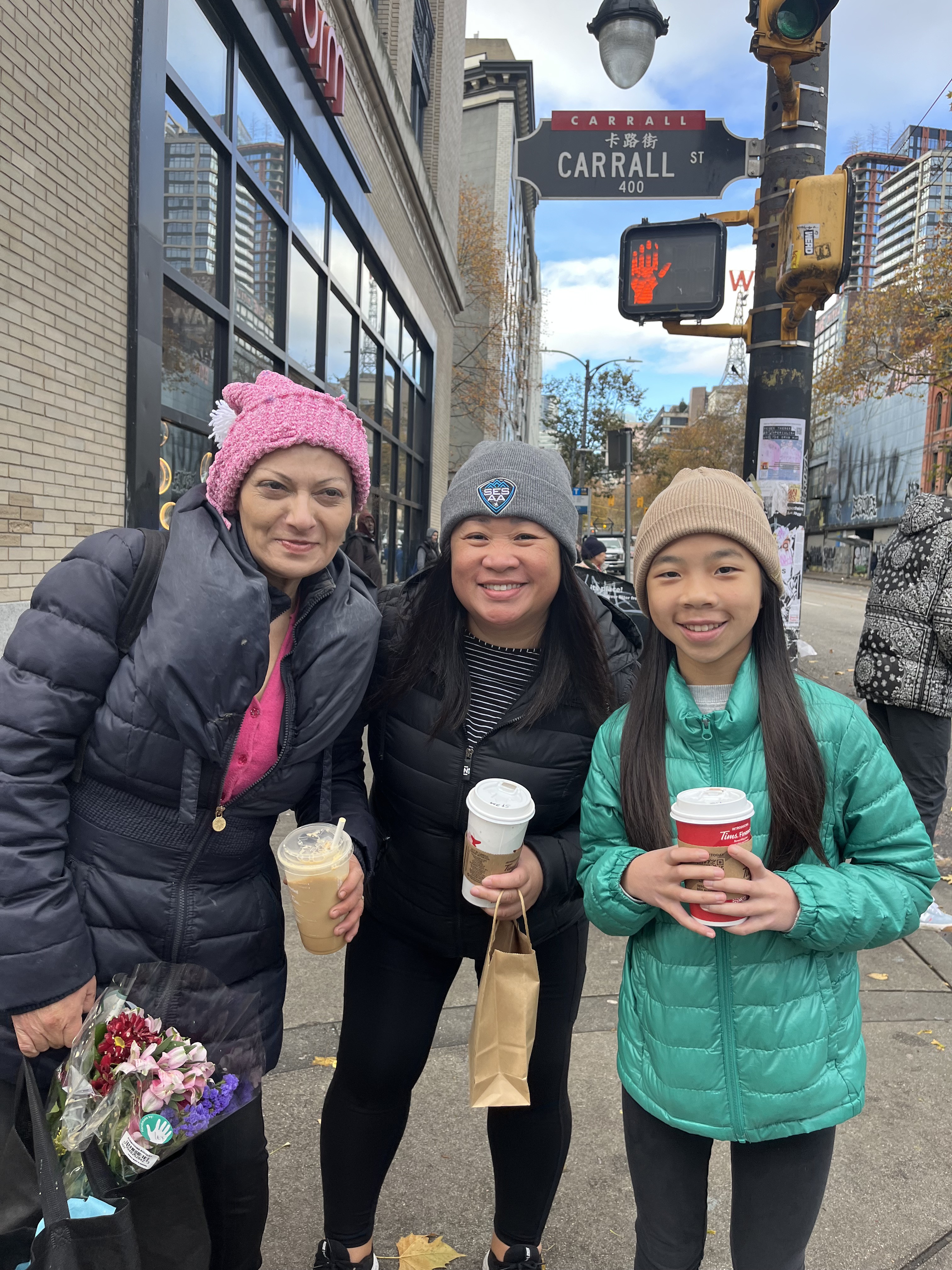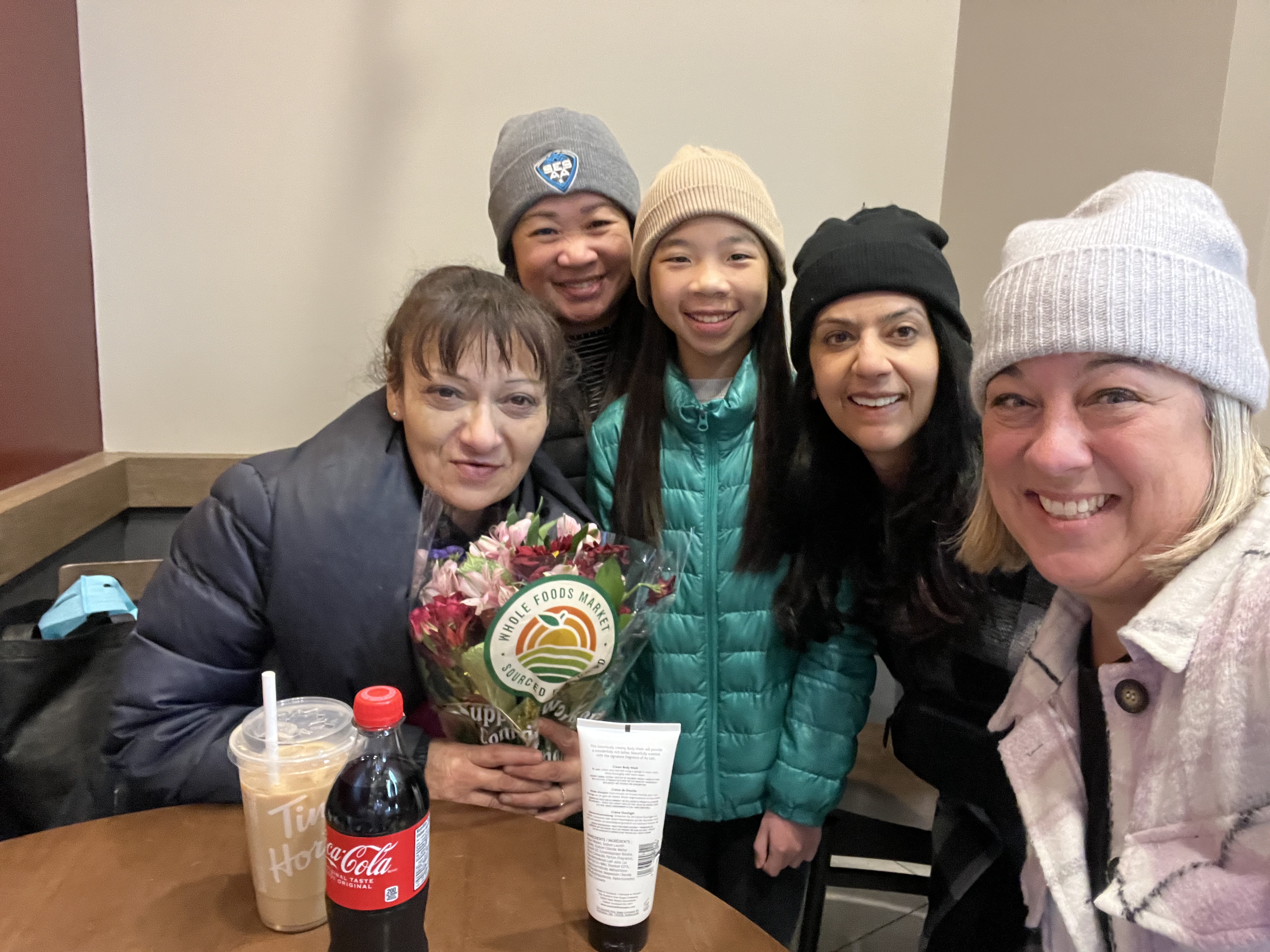 While we chatted, a man in a walker approached with a bouquet of flowers. He didn’t have cash to buy himself a coffee, but had flowers and wanted to know if we would like to buy them. Zahara politely offered him $5 in exchange for the colourful bundle. While he headed to the line to grab a coffee and donut, Zahara offered up the fresh flowers – a perfect and fitting gift for our new friend, Lily.