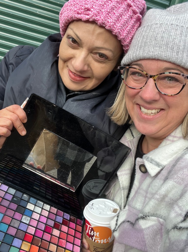 As we sat at the back of Tim Hortons, we emptied our make up bags so Lily could decide what products she might want to take. She assured us she would share with others, and continued to thank us for making her day extra special. She asked for our phone numbers and we all agreed to stay in touch. Lily felt that today was a sign that she should follow her dream and try again as a make up artist. She agreed to contact the women’s centre that had helped her sister to see if she could offer workshops. We agreed to bring her more makeup as needed for her new initiative.